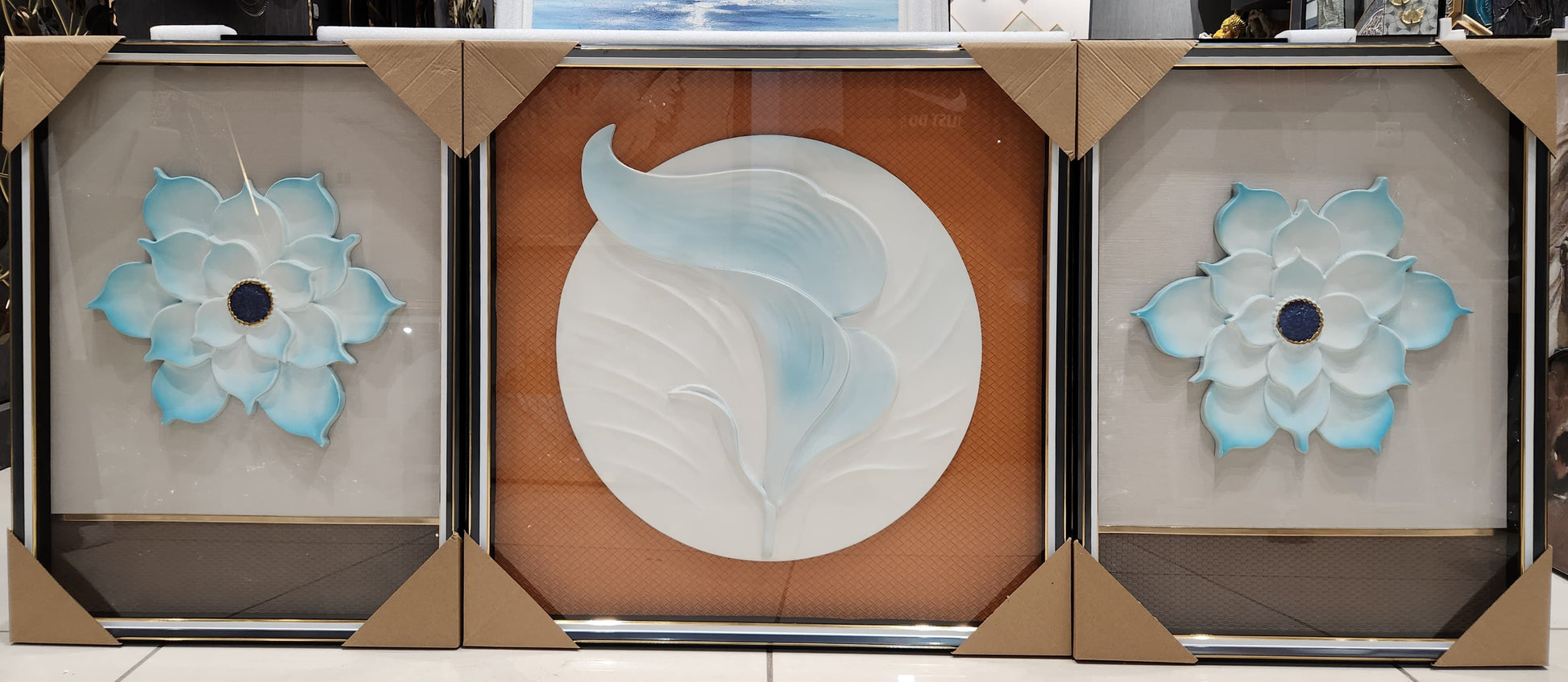 Aqua Bloom 3-Piece 3D Shadow Box Wall Art Set – Modern Floral Embossed Design